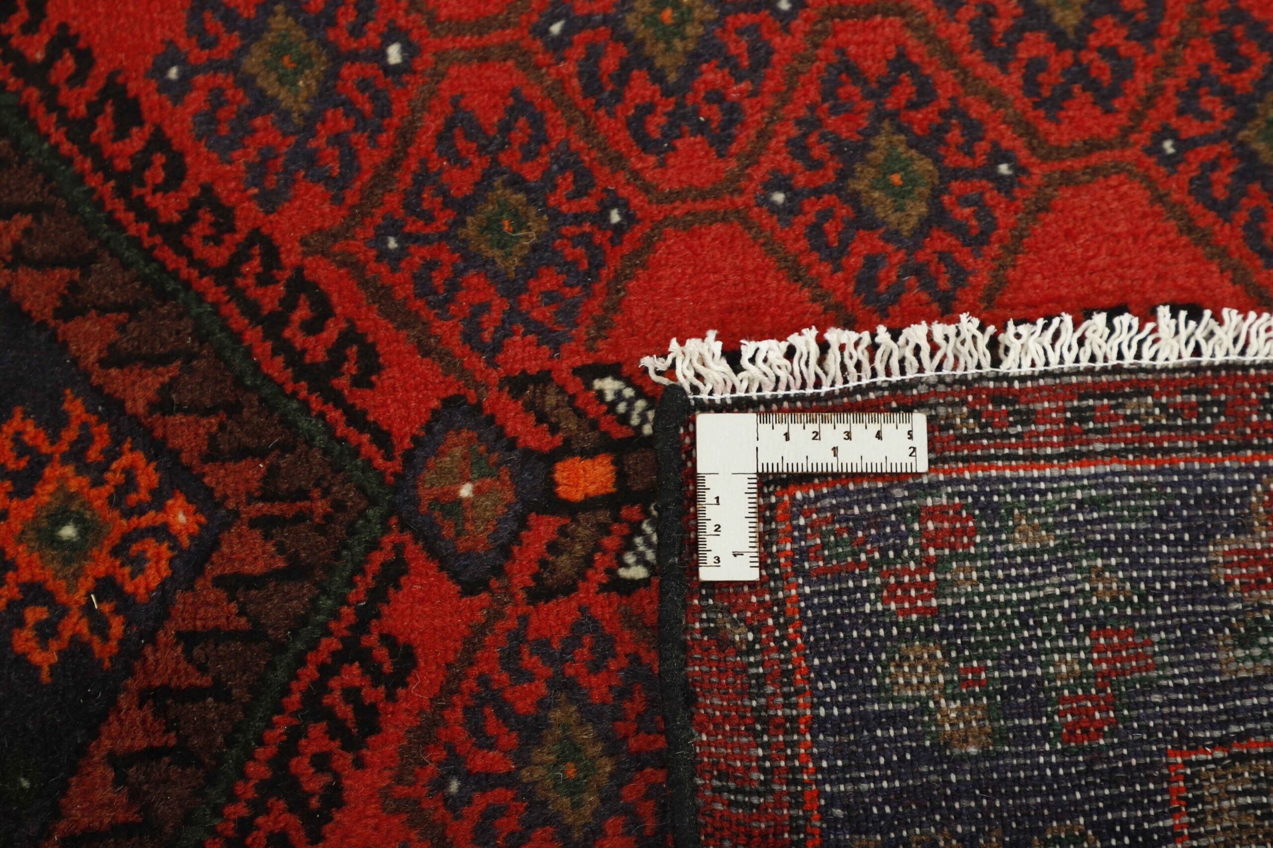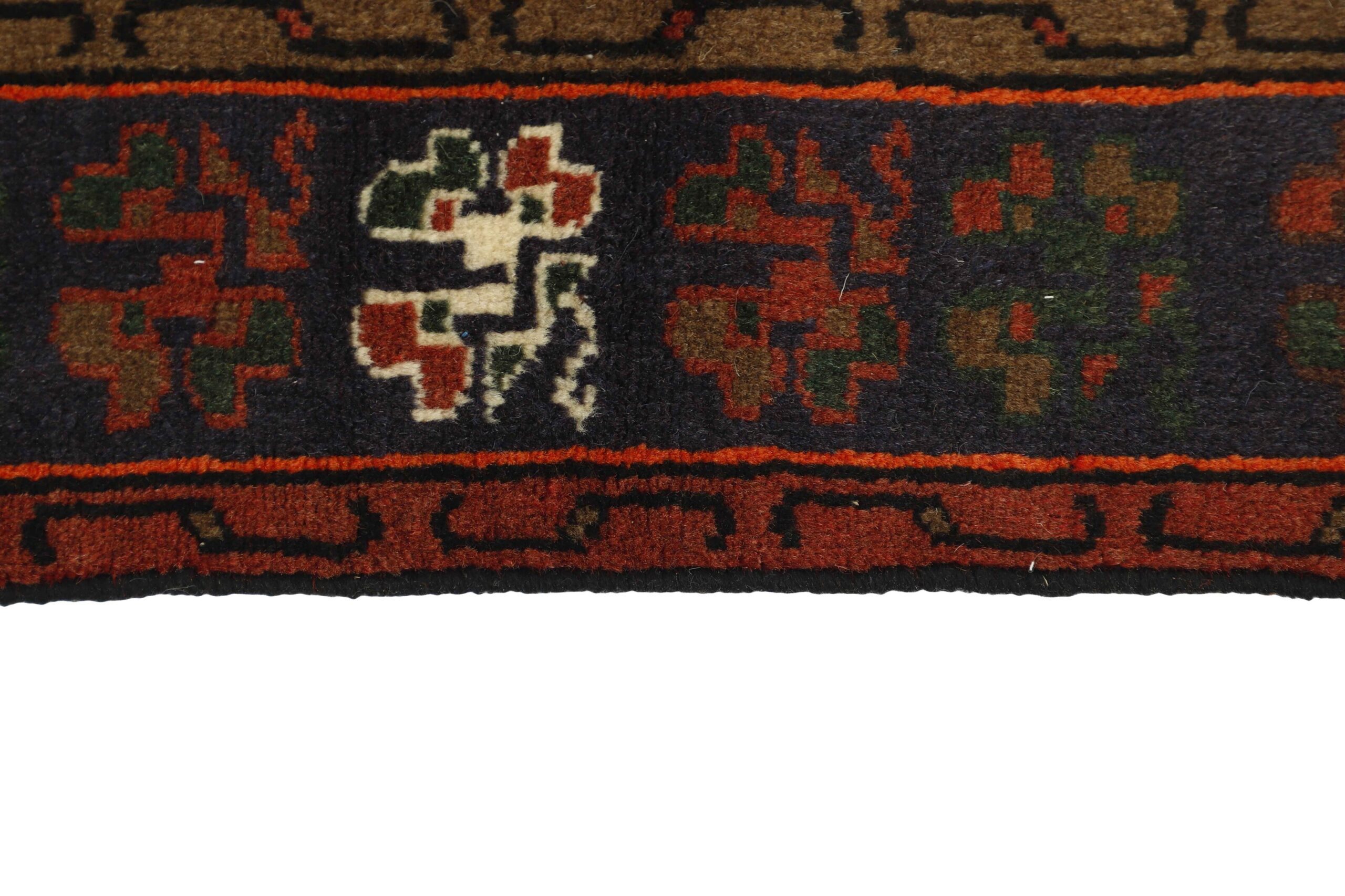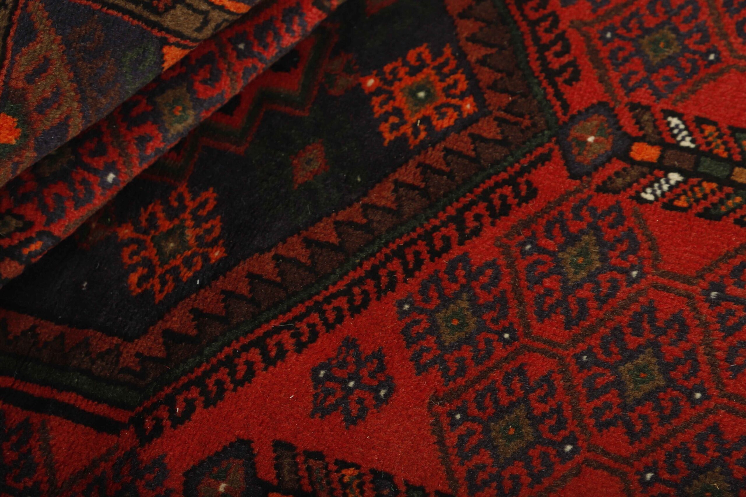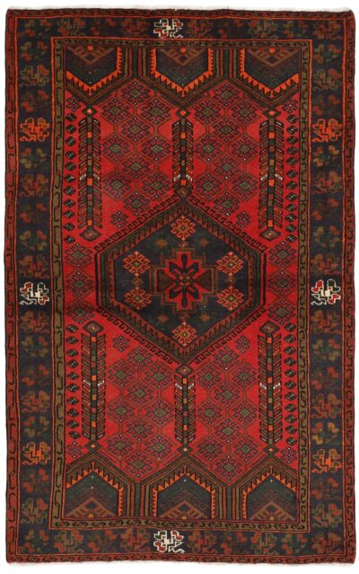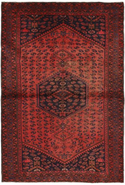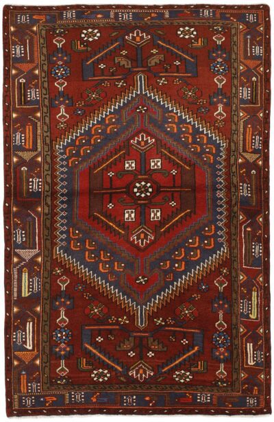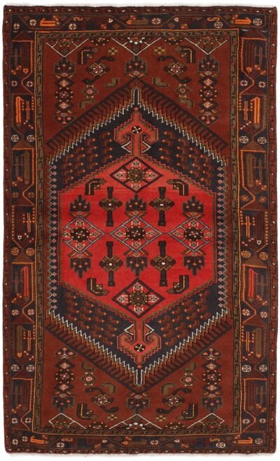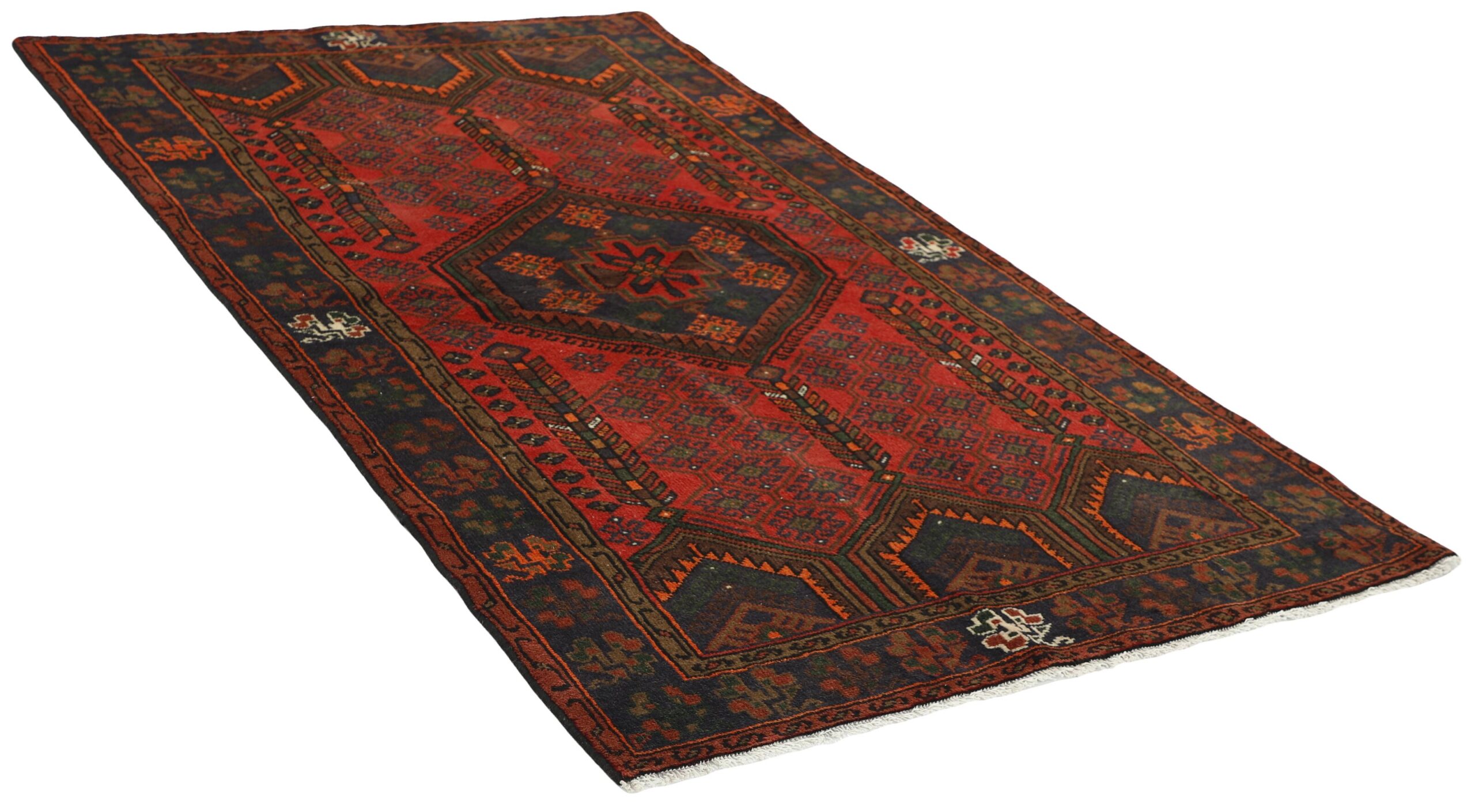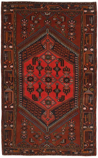This rug is from the district of Hamadan which is an important centre for the rug trade, as well as the most productive rug production area of Iran. Hamadan is a major city with hundreds of thousands of people. Like Ekbatan, it was a main city of the Achemenian kings. It has an indigenous Jewish population and numerous monuments, of which the most important are the tombs of Esther and Mordicai (central to Jewish pilgrims), and the tomb at Avicenna. Hamadan is a provincial capitol. Two types of rugs are knotted. One is the so-called “city rug”, also known as the Shahrbaff. The production is modern and largely state controlled. The village production, however, is much more important; Hamadan is a market city for many rug producing villages that each has its own pattern. Most prominent are Borchalu, Tuserkman, Memraban, Khamseh, Begardeh, Enjilas, Hosseinabad, and Zandjan. There is a wide range of patterns but the quality is very consistent. The colours are strong, and often plant colours. The patterns are daring, although random, and Hosseinabad and Enjilas in particular are known for through going patterns. The rugs are usually not much bigger than 3 by 2 metres.